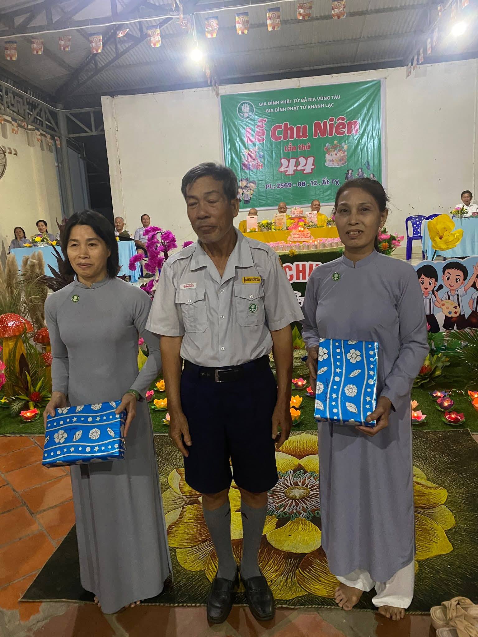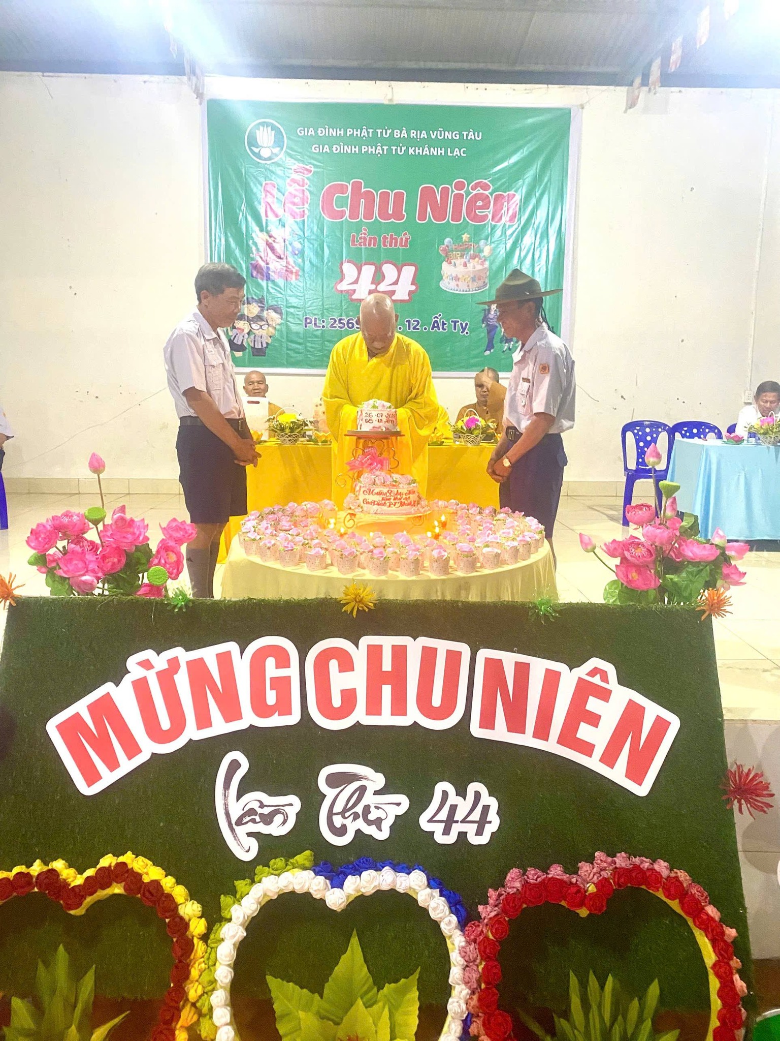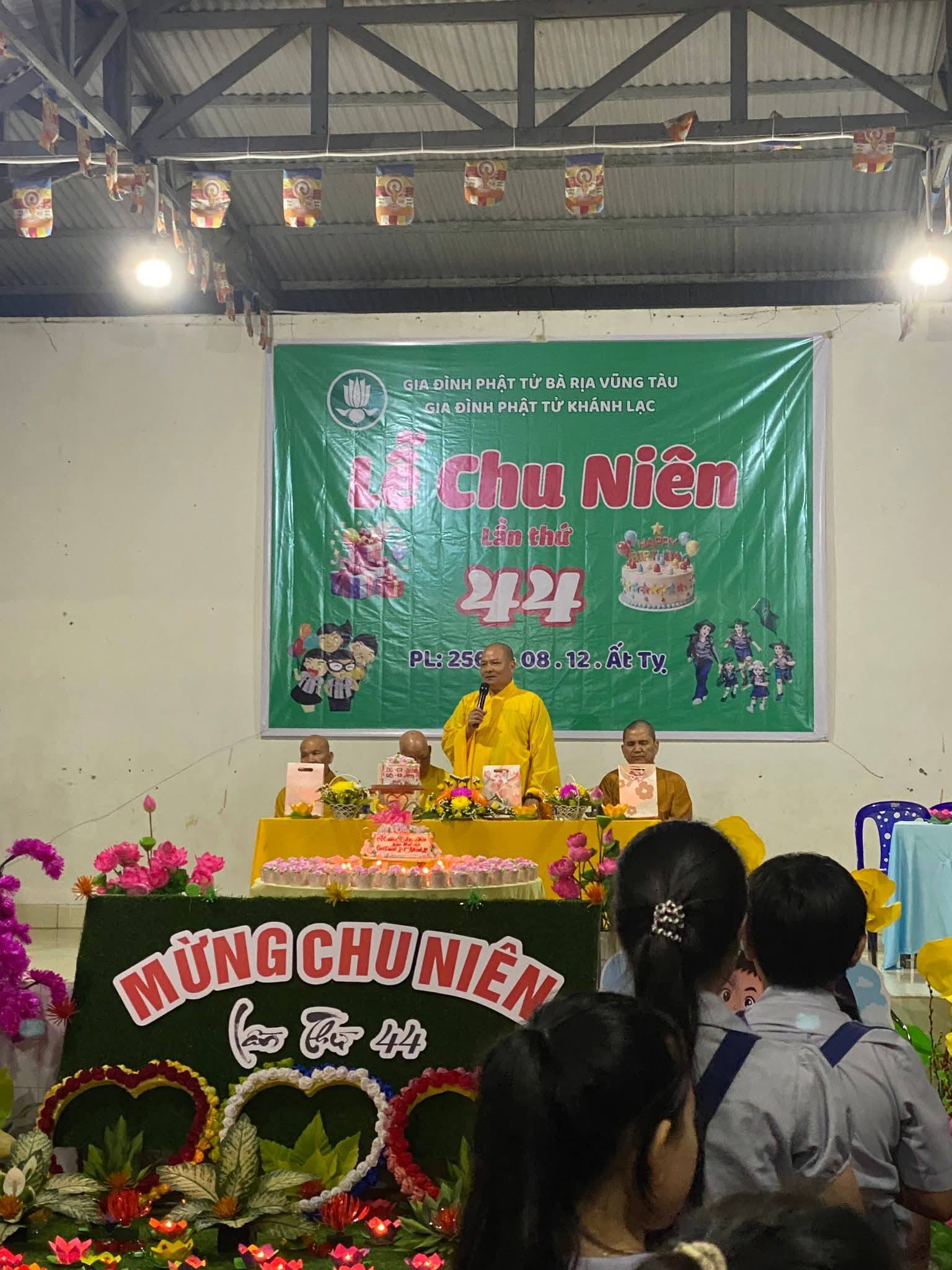 Buổi lễ Chu niên hôm nay dưới sự chứng Minh của Hòa Thượng Đạo hiệu Thích Từ Tri Trù trì chùa Lạc Bang, Ân sư của Gia Đình Phật Tử Bà Rịa Vũng Tàu. Thượng tọa Thích Thông Việt Cố vấn giáo hạnh Gia Đình Phật Tử Bà Rịa Vũng Tàu cùng nhị vị Đại đức tại trú xứ chùa Lạc Bang đồng chứng minh.