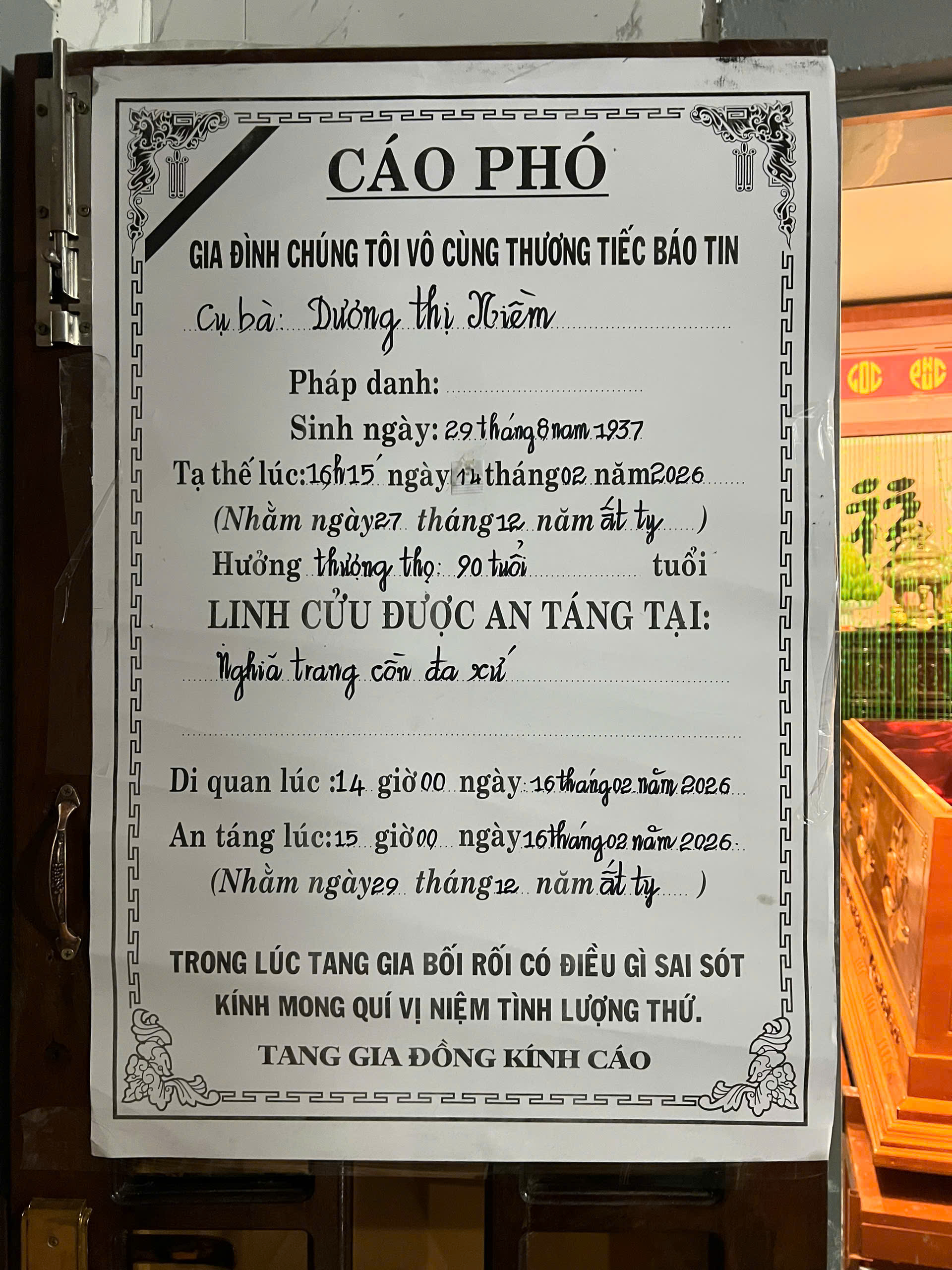 vừa từ trần lúc 16 giờ 15′ ngày 14 tháng 2 năm 2026 ( 27.12. Ất tỵ) tại quê nhà Quảng Trị.